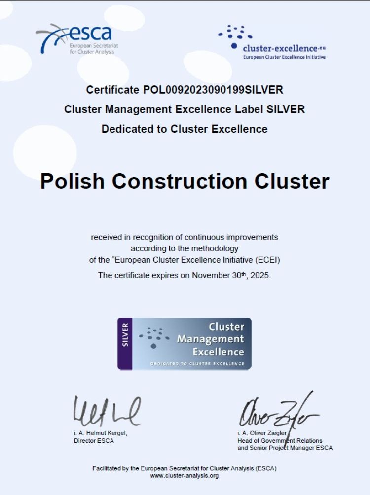 Certyfikat przyznawany jest przez ESCA wyłącznie najlepiej zarządzanym klastrom w Europie, potwierdzając tym samym ich jakość i znaczenie dla rozwoju zarówno regionu, jak i Europy. W związku z tym Polski Klaster Budowlany został wpisany do publicznej bazy danych klastrów otrzymujących to wyróżnienie. Baza danych wszystkich organizacji dostępna jest pod adresem: https://www.cluster-analysis.org/silver-label