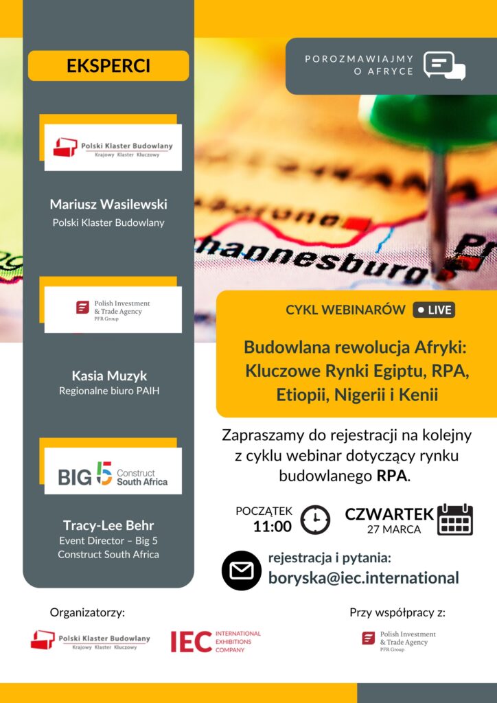Cykl webinarów Budowlana rewolucja Afryki – Kluczowe Rynki Egiptu, RPA, Etiopii, Nigerii i Kenii, który IEC International organizuje wspólnie z Polskim Klastrem Budowlanym.