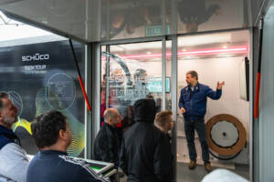 Schüco Tech Tour Truck jest platformą wspomagającą szkolenia i prezentacje rozwiązań z zakresu wydajnej produkcji i cyfryzacji procesów produkcyjnych, dzięki której eksperci Schüco mogą docierać niemal na hale produkcyjne.