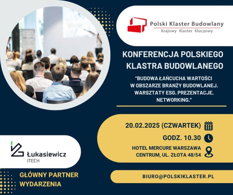Polski Klaster Budowlany zaprasza do udziału w konferencji pt. „Budowa łańcucha wartości w obszarze branży budowlanej. Warsztaty ESG. Prezentacje. Networking”, która odbędzie się 20 lutego 2025 roku w Hotelu Mercure Warszawa Centrum. Rozpoczęcie Konferencji o godz.10:30