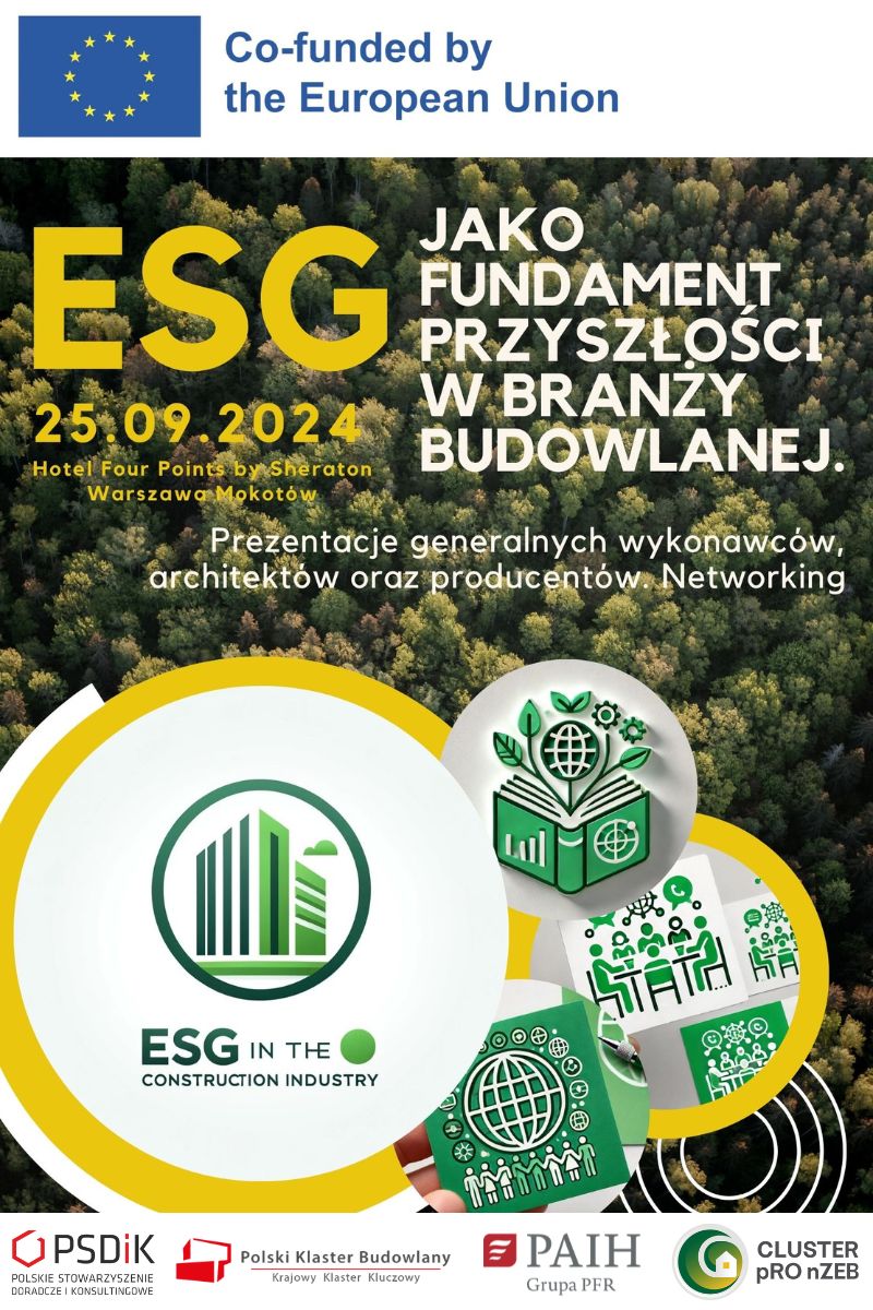 Konferencja jest realizowana w ramach projektu „Kształcenie i szkolenie dorosłych z zakresu wdrażania ESG mające na celu podniesienie kompetencji pracowników branży budowlanej” o numerze 2023-1-PL01-KA210-VET-000153723 współfinansowanego ze środków Unii Europejskiej w ramach programu Erasmus+, akcja kluczowa 2: Partnerstwa na małą skalę w dziedzinie kształcenia i szkolenia zawodowego. Projekt jest realizowany przez Polskie Stowarzyszenie Doradcze i Konsultingowe – operatora Polskiego Klastra Budowlanego Krajowego Klastra Kluczowego (Lidera) oraz Asociatia Cluster Pentru Promovarea Cladirilor Cu Consum De Energie Aproape Egal Cu Zero PRO NZEB z Rumunii (Partnera). Konferencja ma na celu podsumowanie projektu z podkreśleniem jego efektów oraz zaprezentowanie zrealizowanych działań i wypracowanych rezultatów.