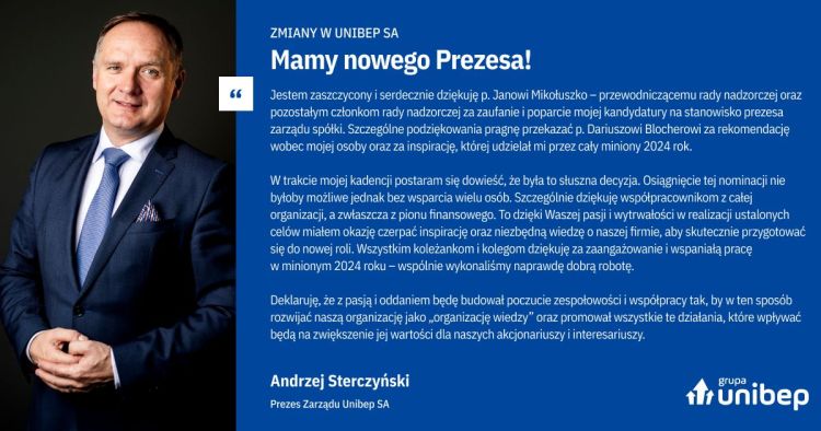 🔹 Dariusz Blocher zidentyfikował problemy, z jakimi się borykaliśmy i wyznaczył kierunki rozwoju, które będziemy konsekwentnie kontynuować, by nasza działalność stałą się bardziej efektywna. Cieszymy się, że pozostaje z nami, jednak w innej roli – zasiądzie w Radzie Nadzorczej, gdzie prawdopodobnie obejmie rolę przewodniczącego Komitetu Rozwoju. Decyzję w tej sprawie podejmie Rada Nadzorcza. Dziękujemy za jego kluczowy wkład w rozwój Grupy Unibep.