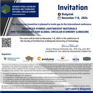 Polski Klaster Budowlany w imieniu Komitetu Organizacyjnego LIMACON ma zaszczyt zaprosić Państwa do udziału w 2. międzynarodowej konferencji Advanced Hybrid Lightweight Materials and Technologies for Global Circular Economy (LIMACON), która odbędzie się w dniach 7-8 listopada 2024 (www.pb.edu.pl/limacon/) w audytorium Wydziału Architektury Politechniki Białostockiej. Wprowadzanie innowacyjnych rozwiązań jest napędzane rozwojem współpracy międzysektorowej oraz krajowych i […]