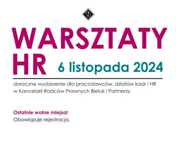 W imieniu Kancelarii Radców Prawnych Bieluk i Partnerzy zapraszamy na warsztaty dla pracowników, działów kadr i HR. Bieżące wyzwania pracodawców: sygnaliści i zakończenie stosunku pracy TERMIN: 6.11.2024 MIEJSCE: Centrum Szkoleniowe Warszawska 14, ul. Warszawska 14 (wejście od szczytu budynku) Białystok PROGRAM BLOK I 9:00-10:30 Jak skutecznie rozstać się z pracownikiem: redukcja zatrudnienia w świetle przepisów […]